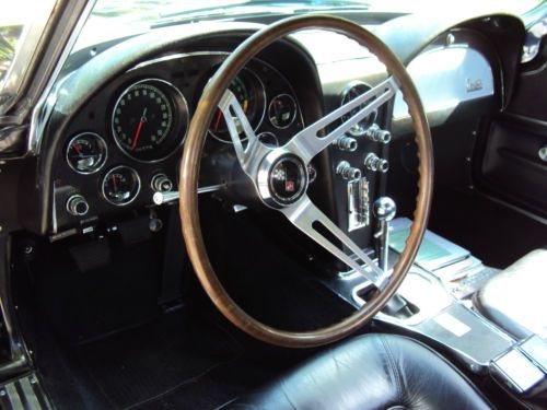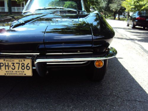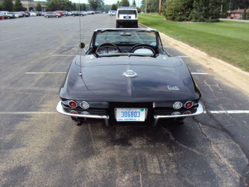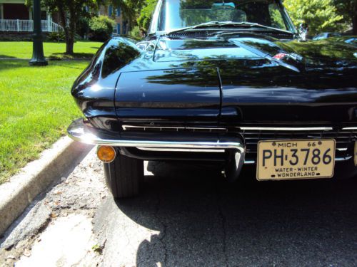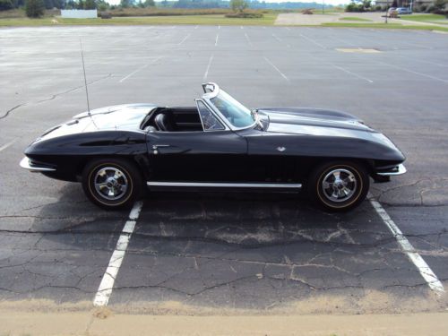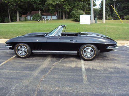 For Sale is a 1966 Chevrolet Corvette Sting Ray Convertible with hardtop Tuxedo Black (original color) that sports the original numbers matching 327/350 4bbl L79 motor and the original numbers matching 4sp transmission. This vehicle had a frame off restoration in 1992/93 at Ganton Classics Professional Restoration in Jackson, Michigan. This is a rare car as stats show 27,720 Corvette's were produced and 1105 were Tuxedo Black which is less than 4%. When you add in triple black with a black hardtop I am sure the numbers go down even more. The car has several options inclunding ps, pb, power antenna, 4sp, am-fm radio, soft ray tinted glass, posi, convertible (w/hardtop), 327/350hp and leather interior (not original although upgraded with frame off). I have a ton of documents including restoration pictures and I am the 5th owner of car. This Corvette has about 5300 miles since frame off in 1992/93 and has been garaged and covered ever since. Built in St Louis late September 1965. VIN 19467S101940 Original delivery to Crutchfield Chevrolet in Jackson, Michigan. Purchased by Dennis Kelosky. Sold back to Crutchfield Chevrolet and purchased by James Duncan. Purchased by Clyde LaTarte in 1989. President Jackson Community College and former State Representative. Frame off in 1992/1993 at Ganton Classics. Purchased by Mike Austin in 1996 with 3500 miles on car since restoration. I recently purchased car and it now has 5300 miles since resto. Ganton Classic Cars, Jackson, Michigan. Lloyd Ganton (nationally known classic car collector/resto expert). New interior, new leather seats with original seatbacks/frames. New chrome although bumpers are original. New dash, restored instruments, am-fm radio, wiring and hose replacement. Restored power antenna, has original glass, Firestone Gold Line tires and original wheel covers, McEldowney Racing, Jackson, Michigan. Frame replaced, new exhaust, shocks and gas tank. Rebuilt numbers matching 327/350hp L79 motor and kept stock bores. Rebuilt numbers matching transmission, Alternator, Generator, Radiator, Power Steering, SS Brakes, Calipers and Lines. Hardtop has not been restored and still has original paint and is Black. This is a very solid Corvette that is original and will continue to increase in value. Very rare Tuxedo Black with 327/350hp motor. Please ask questions and good luck bidding.