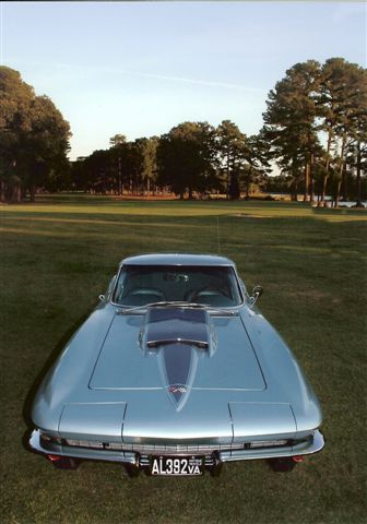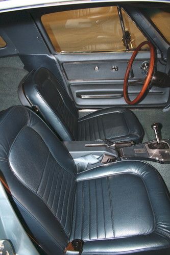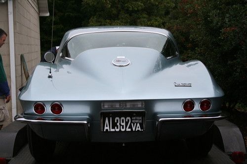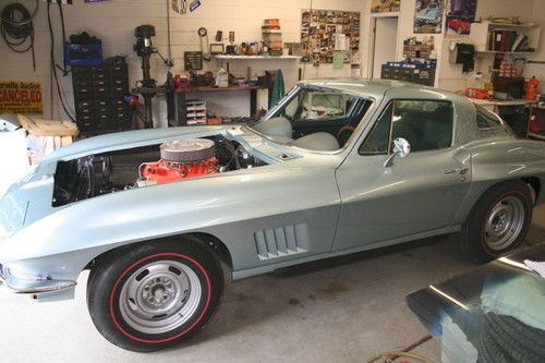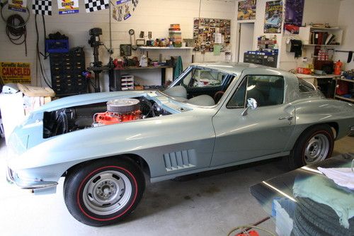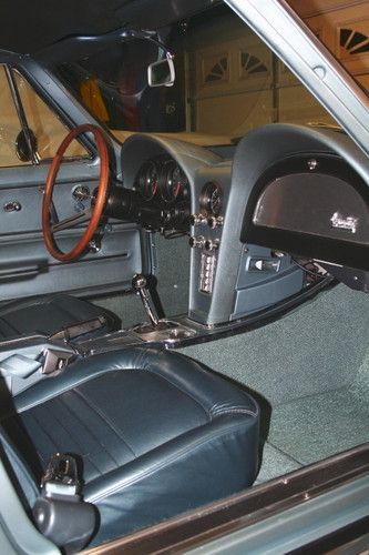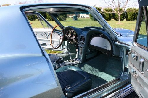1967 Corvette Coupe, 427/390 HP, numbers matching, Elkhart Blue exterior with Dark Teal leather interior, T21 four speed manual, 355 rear, side pipes with stainless steel ceramic coated exhaust, teak steering wheel, redline tires, rally wheels, power steering, AM/FM radio, clock, powder coated frame.