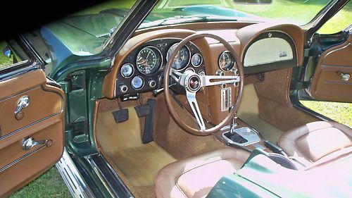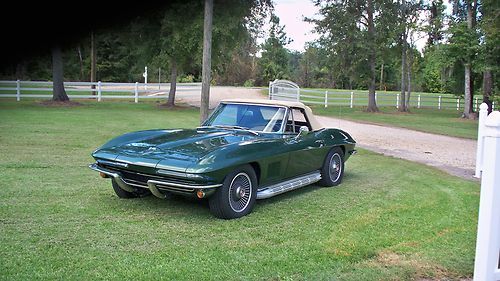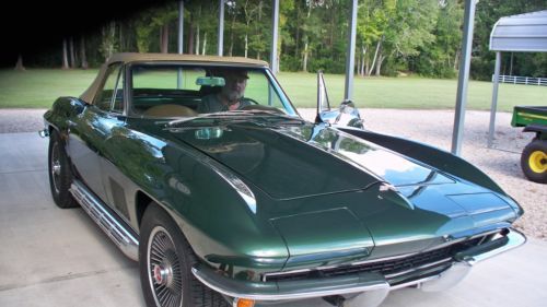 1967 Corvette Convertible, 327-350hp, with 4 speed, matching #'s. Goodwood Green paint. Original color was 488 code and was professional repainted in the early 2000's. Paint is showing age. Also features Saddle Tan leather interior and Tan soft top. Optioned with factory side exhaust, speed warning, M-21, 3.36 posi, Am/Fm radio, seat belts, tinted windshield, aluminum wheels, with extra set of red line tires. Interior is in good condition,(see pictures), have documention of repairs and purchase from 2004. Under carriage is in good condition. Has complete MSD system, MSD box, MSD coil and distributor. Runs and drives excellent.... If you drive it... you will buy it, inspection is available by appointment.