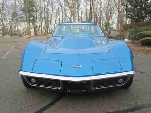Up for auction is a 1969 Chevrolet Corvette T-Top Coupe in very nice condition. It is equipped with a 427 cubic inch engine with a single 4-barrell carb. The car has an automatic transmission but did come new with a factory 4-speed rock crusher trans. The clutch pedal assembly is still in the car pulled up out of the way should someone want to bring it back to the stick trans. This exchange happened as I understand it about 22 years ago so that the wife could drive it. The car was painted way back then as well and has been well cared for being kept in nice condition. While the car shows well and has been sheltered, it is obviously not top show quality as there are some chips and small scratches and blemishes in the paint as you would expect. For a mighty big block car, it has taken the years very well and gets a lot of attention no matter where you go.