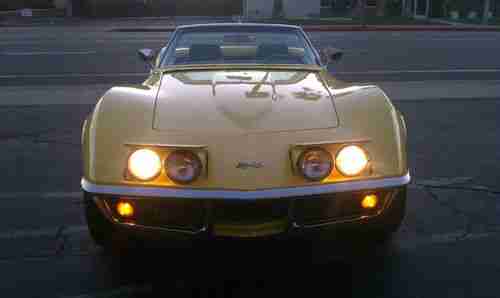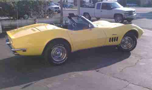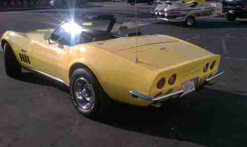 This is a 1969 Chevrolet Corvette Stingray. The car is in good condition and runs and drives great. We have over $12000 in receipts for work done on the car by the previous owner, mostly from J & D Corvette in Bellflower. Most of the work was performed in 2004 and all the receipts show the miles as 86,262. We took the car in with 86,262 miles so its obvious that the odometer stopped working, so we will be selling the vehicle with true miles unknown. There are a few blemishes and scratches that I have included in the photos. The convertible top is new but needs some adjusting as we have been unable to latch the back part of the top when the front is latched, it's just too tight. The radio gets power to it but does not make any noise or show any stations on the display. The interior lights on the dash and the instrument cluster are not turning on, all exterior lighting works properly.