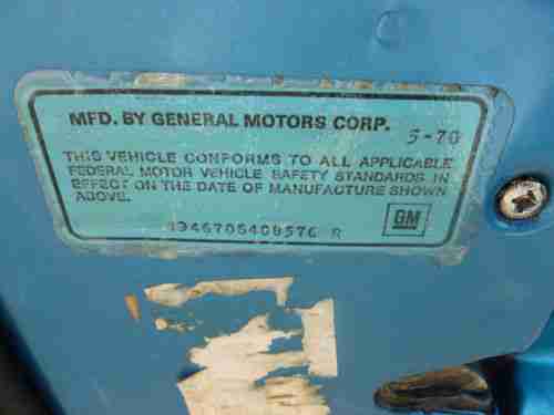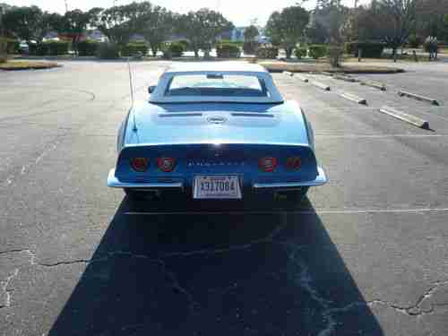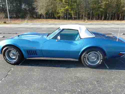 1970 CHEVY CORVETTE CONVERTABLE, 454/390 HP, 4 SPEED. THIS IS A ONE OWNER CAR THAT IS ORIGINAL BESIDES THE EXHAUST & THE TOP IS NEW. HAVE ALL ORIGINAL PAPERWORK, BILL OF SALE& TANK STICKER,ETC. CAR DOES HAVE SOME DOOR DINGS ON IT FROM SITTING IN A GARAGE, HAS ORIGINAL RADIO BUT DOES NOT WORK, CLOCK WORKS BUT DOES NOT KEEP GOOD TIME. PLEASE CALL IF YOU HAVE ANY QUESTIONS 843-446-5500.