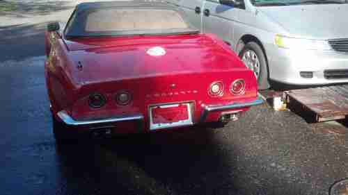 1972 Corvette convertible, 350 ci automatic trans. has 1973 nose with damage. Matching numbers engine and transmission. Engine runs but rough. In storage for 15 years. Car is complete with excellent frame and floors. Original color is black with red int. needs light restoration, interior needs good cleaning but mostly original. Tires are shot. Has ac but no compressor. Clear title. Call John 203-913-1626.