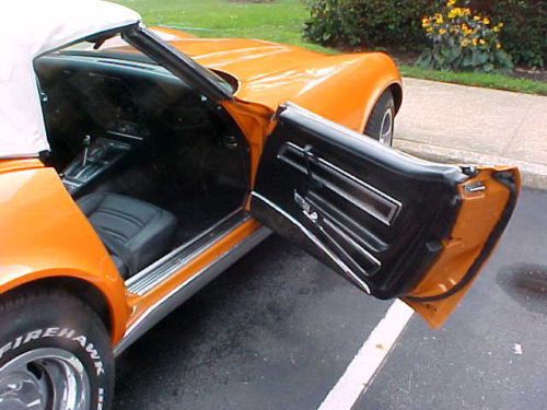 THIS 1973 CHEVROLET CORVETTE CONVERTIBLE IS REGISTERED, TITLED, INSURED AND INSPECTED IN MY NAME. IT WAS MY SUMMER DRIVER AND I HAVE DRIVEN IT OVER 2000 MILES THIS SEASON. THE CORVETTE HAS A BEAUTIFUL REPAINT OF CORRECT CORVETTE ORANGE, A 1973 COLOR. THE PAINT REQUIRED MINIMAL SERVICE, JUST A QUICK WIPE WITH SOAP AND WATER AND IT SHINES WITH A GORGEOUS LUSTER. I GET COMPLIMENTS EVERYWHERE I GO WITH THIS CORVETTE, ESPECIALLY WITH THE TOP DOWN. INTERIOR SEATS WERE REDONE WITH BLACK LEATHER AND HAVE A WATERPROOF COATING. IF YOU GET A SUDDEN RAIN SHOWER, THE SEATS WIPE CLEAN WITH NO STAIN OR MARKS. ENGINE IS ORIGINAL L48 WITH CLA SUFFIX AND M40 TURBOHYDRAMATIC 400 TRANSMISSION . TRANSMISSION WAS JUST SERVICED WITH NEW FILTER AND FLUID AND BANDS TIGHTENED. CAR STARTS, DRIVES AND SHIFTS BEAUTIFULLY. BRAKES WERE REDONE RECENTLY, AND RECENTLY ADJUSTED AND INSPECTED AS WELL AS CHASSIS. CHASSIS IS VERY WELL PRESERVED, AND HAS SPARE TIRE AND TIRE CARRIER. OPTIONS INCLUDE POWER STEERING, POWER BRAKES, POWER WINDOWS, LEATHER SEATS, FACTORY A/C. CONVERTIBLE TOP SEATS IN MOUNTS, SEALS AND GOES UP AND DOWN WITH EASE AND TONNEAU HAS EASY RELEASE AND LATCH. HEADLAMPS, WIPERS, WINDOWS ALL WORK GREAT. 1973 HAS NEW NHTSA 5 MPH RUBBER BUMPER IN FRONT AND 1968-1972 CHROME REAR BUMPERS. CHROME IS VERY GOOD CONDITION. THIS IS AN EXCELLENT CORVETTE FOR THOSE WHO WANT TO ATTEND CRUISES, SHOWS, CONVENTIONS AND TOURS WITH AN ANTIQUE CAR THAT HAS MANY MODERN SAFETY AND RELIABILITY FEATURES. THESE FEATURES INCLUDE FULL PADDED DASHBOARD, STEEL GUARD DOOR BEAMS, EXTRA BODY MOUNTS, HEAVY SOUND DEADENING GIVE A QUIET AND COMFORTABLE RIDE. WHEN THE TOP IS DOWN, YOU HEAR A LOVELY EXHAUST BURBLE AND THE RAKED WINDSHIELD PREVENTS WIND WHIPPING AT YOUR NECK, AND DEFLECTS LIGHT RAIN SHOWERS. TRULY A GREAT CORVETTE FOR TOURING AND CRUISING. AUCTION IS BUY IT NOW FOR $24,999.00. DRIVE IT HOME. ENJOY THIS CORVETTE. EASY TO DRIVE AND ENJOY WITH MORE MODERN FEATURES THAN EARLIER CORVETTES. |