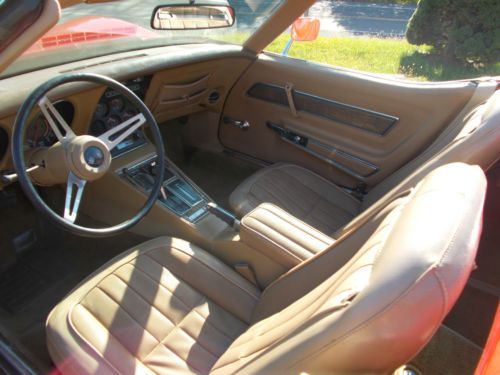 Up for auction is a beautiful 1974 red Corvette convertible. I am selling this car for a friend. It is equipped with an automatic transmission, tilt/tele steering wheel, light saddle interior, a white convertible top, and the classic Corvette luggage rack. This car has the matching number engine and has 78,376 miles.