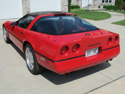 I Have owned this car since 1989. Bought from local chev dealer. It had 1,800 miles on it. I am the second owner. Never been in accident, hit curb, etc. orig paint in great shape. Garage kept. Has EVERY option for the year! Red top and blue glass top. 17" wheels with tires in very good condition. Lager brakes, stiffer suspension. gas shocks, tighter steering gears box, optional 3.07 rear gears, optional mufflers, oil cooler, leather sport seats. auto a/c. Bose stereo, Car starts great burns no oil, has sat in same spot for last 12 years and floor shows no leak spots! Car has been properly maintained. Ok, now the bad stuff. Yes the car is over 24 years old. It has a deep scratch on bottom of pass door, it was there when got the car. The car has sat in my garages and has been scratch here and there. Had car detailed 5 years ago and the body shop said the paint was in great shape. Both seats lumbar air pumps do no work. These are about $150 each. I never fixed as I am 6'2" and need all the room I can get. These are the best stock vette seat ever! The alt belt cherps if you rev the motor ( it has done this since new! I think it was a common problem with the motor. I put new belt on a few years ago and it made more noise than the original. The oil pan bottom has been dented a bit. There is still an inch of clearance up to the oil pick up so no problem. Needs rear window seal. Car has been lowered 1 inch. The orig Y pipe and Cat are included but not on the car! Car get aprox. 20 mpg! Spare tire and carrier alos not on car but included.
