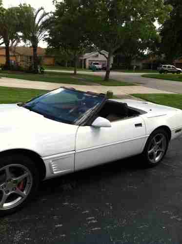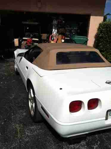 I have for sale a 1989 Arctic White Convertible Corvette with Hardtop and 1996 body kit. This car has less than 69,000 miles(68,825 as of posting). The tan convertible cloth top is in great condition, just installed last year, and was stowed most of the time, since we loved the look of the hardtop. This car has dual power front bucket seats, the original leather skins,(included in sale), were in great shape, so i removed them and stored them away, and installed leatherette skins, an aftermarket multimedia radio with navigation, DVD, Ipod hook ups, bluetooth etc.(also have factory Bose radio system), aluminum C-5 wheels, Factory CC2 option hardtop with stand, has brand new Accel injectors installed, new Accel braided spark plug wires, Accel cap and rotor, new fuel and air filters, new battery, new alternator, front shocks, drilled and slotted rotors and pads, caliper covers, breathless intake snorkel, H-4 headlights, new carpet, all new weather stripping and window seals(doors, A-pillar, door belts, convertible top),and much more. I have a bunch of extra parts, manuals, CD's etc. and some optional parts available as well. All power options work, including windows, door locks, cruise control, latches, mirrors, etc. A/C works and is cold(converted to 134A). There are a bunch of other things done and replaced I'm sure I've missed, so please call with any questions. The car shows well, runs well and turns heads, but it is by no means a show car, but looks great for it's age. I'm not sure but I believe it becomes a classic next year. Thanks for looking, and good luck.