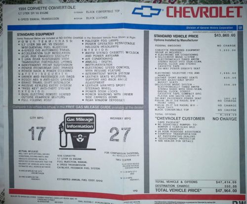 This 1994 Competition Yellow Chevrolet 6-speed manual transmission Corvette with 16,000 original miles is in excellent to near mint condition! It is equipped with all the available options for that year less the optional hardtop. Have original window sticker with all service records since ownership in 2000. Please see photo of window sticker. There are no dings or scratches, only the three very minor paint chips on back of passenger mirror,lower right & front fender that have been touched up with matching paint, other than that it is in near perfect condition inside & out! Always kept in a climate control garage and never ever driven in bad weather. Only selling due to lack of time to enjoy driving it. Please ask questions and I will answer back ASAP. PLEASE NO LOWBALL DEALERS!! THANKS FOR LOOKING:) On May-29-14 at 13:45:18 PDT, seller added the following information: **** Also Included in this sale is a nice cover, service manuals and actual Brand New (in the box) black leather replacement seat covers if in the future you would want to replace the original ones***** |