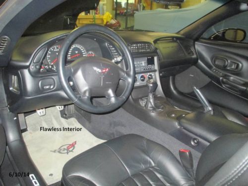 You are looking at a first year hard top Corvette. It is a rare FRC model (Fixed Roof Coupe). The FRC was first offered in 1999 and just over 4000 units were built. They were only offered in Black, Red, or White, and only with a 6 speed stick and black interior. Only 1227 black models were made. The FRC became the chassis for the ZO6 in 2001. I purchased this in 1999 and have been the only owner and driver. I have maintained it as an original factory car. It had Wet Okole seat covers on both seats until last year, so leather is brand new. Carpets and floor mats are perfect. No flaws or damages at all in the interior. It is clean throughout. Outside paint is as perfect as it can be. There are a couple of small nicks, one from a stone on the nose under the license plate, and one from the handle of the garage door on the rear panel just above the license plate. Both are touched up and hard to notice. Paint has been cared for with 3M products for swirl removal and buffing, Finish First for polishing. Wheels are the original alloy but have been chrome dipped for a beautiful finish. Tires are Toyo Proxes T1R with 2000 easy miles on them. Brakes are upgraded to ceramic pads. System flushed every two years. Oil has always been Mobil 1, changed spring and fall. Only changes to stock is the air intake to a K&N cold air box (I have all of the original parts boxed) and a Cat Back Stainless Steel 4" Billy Boat exhaust that gives the car a mellow purr on normal driving, but with a raspy bark on acceleration, very nice. All windows are tinted black and both license plates are behind tinted Plexiglas covers. Car looks like a shiny black panther ready to leap. Drives great with very tame clutch. Acceleration is impressive and handling is extremely stable at any speed. In fact, the faster it goes, the better it handles. Has traction control and can be turned off with a push button on the console. The car can get 31-32 mpg on the highway in 6th gear. Around town with normal driving gets 19-22 mpg. Not bad for a performance car. Gotta love the 6 speed stick. This car could become more valuable as the first ever Corvette FRC. I've maintained it with that in mind. It is also a great driver, so you choose. This car has never had to deal with bad weather. Only in rain a couple of times, never in snow or wind. Always kept in a climate controlled garage with my other babies. Always washed with soft water. Sale includes a 3 volume factory shop manual (never used), fitted car cover, mats, jack pucks. Time to move on and make room for something else. I'll be sad to see him go. Still excites me every time I get behind the wheel. Buy this car with confidence that you are getting a show room condition Corvette that turns heads everywhere. Contact me with any questions or requests. I'm also happy to make the car available for inspections. BTW; In 2005 it won best in class at the famous Vettes in the Rockies in Breckenridge, Colorado. It looks exactly the same today. Cheers.....Les (Did I mention only 1227 were made???) |