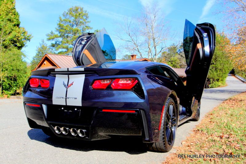 A TRULY SPECTACULAR 2014 Z51 CORVETTE WITH CUSTOM LAMBO DOORS, DEEP TINTED GLASS, RACING STRIPES FROM THE FACTORY, POWDER COATED 10 SPOKE BLACK CORVETTE RIMS, OPTX LED (FRONT GRILL, FENDER GILLS AND REAR BUMPER) BLUE ACCENT LITES, COLD AIR INTAKE FROM AFE 46HP BOOST, 13.6" SLOTTED LARGE ROTORS, 9000 BABIED MILES ALWAYS GARAGED NO INCLEMENT WEATHER, 10 SPEAKER BOSE SYSTEM, KALAHARI SUEDED TAN LEATHER INTERIOR, CAR LOWERED TO MAX BY DEALER, "AL PRIORITY" LASER PARKING SYSTEM FRONT AND REAR WITH ON DASH CONTROLS.
