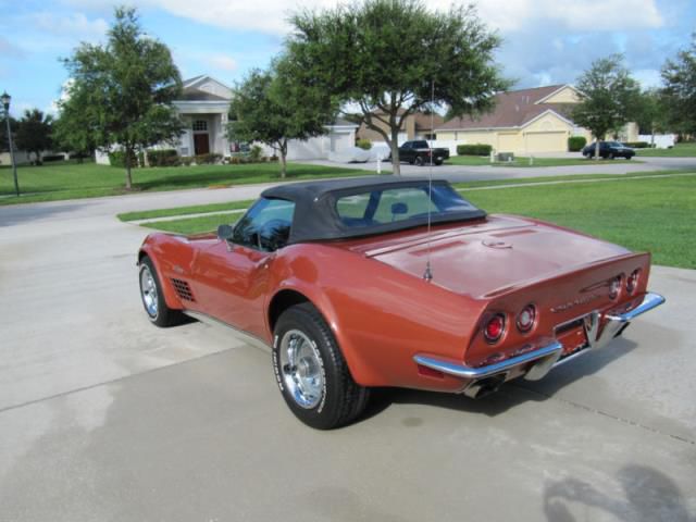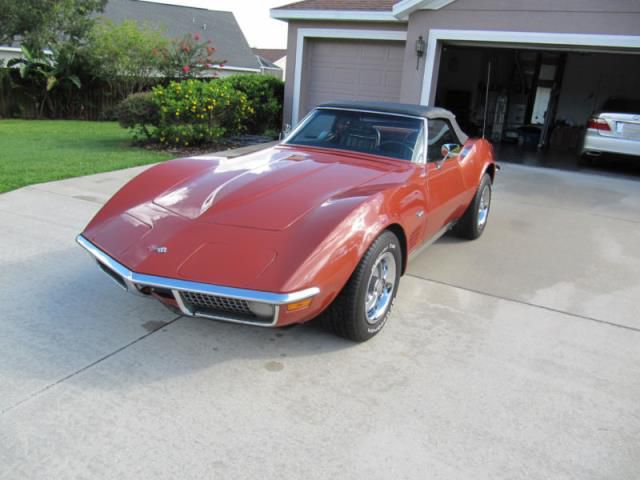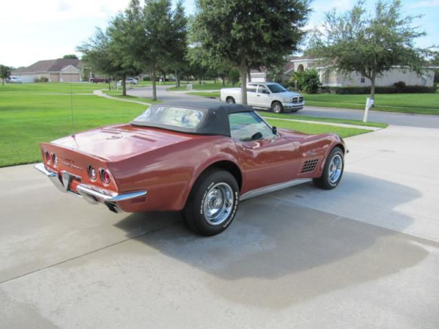 Chevrolet Corvette Stingray Roadster (code 67), 1 of 6648, Corvette Bronze (code 993), Interior Black (code 400), Factory Delco AC RPO C60 (1 of 6659), Power Steering RPO N40 (1 of 11907), Power Brakes RPO J50 4 wheel disc, 11.75, Factory Rally Wheels, 8 x 15 (5), 350 CID RPO ZQ3, w/10.25:1, 300 hp @ 4800, Muncie 4 speed RPO M21 close ratio, 12 Bolt Positive Traction RPO CAM G81 w/3.36:1, Tilt - Telescoping Steering Wheel RPO N37 (1 of 5803), AM - FM Radio RPO U69 (1 of 14529). This car is very original. One repaint with original factory color. Car has been completely redone. Engine, transmission, rear end, drive line parts, exhaust, brakes, calipers, fuel lines, brake lines, all suspension and steering parts, including body bushings. Built back to factory specs. There has been an aluminum intake installed as well as an electric ignition. It has a Holley Spread Bore atop.