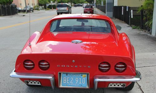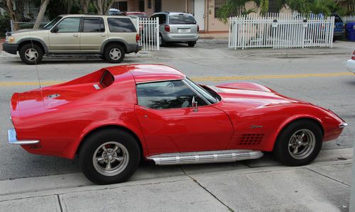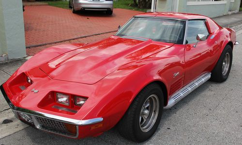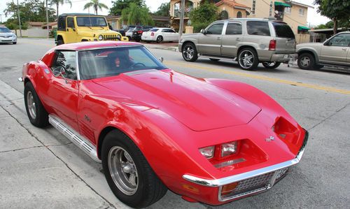 Neck snapping 1972 Corvette Stingray, last year of the chrome bumper Vettes. I'm selling this car for my brother. It has the 350 motor with an automatic transmission, solid t-tops, pw, pb, side pipes, beautiful good condition shinny red paint, customized hassle-free headlights, you will never have to worry about the usual problems associated with the headlights not working properly. It has Mag wheels, the wipers, radio, turn signals etc work, ice cold AC. This car is absolutely ready to be driven anywhere, this is no show trailer queen. Please look at the photos and ask any and all questions before bidding as this is obviously a non returnable item. You are welcomed to come and inspect the car in person prior to the end of the auction. This car is by no means a show-car, but it is a very nice driver quality 41 year old car that runs strong, and sounds as good as it looks. Let us not waste each others time. Please make sure you have the funds to buy the car before you bid. Buyer is responsible for the collection and shipping costs. We can store the car for 3 weeks, but it must be paid in full within 7 days of auction end.
