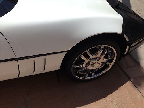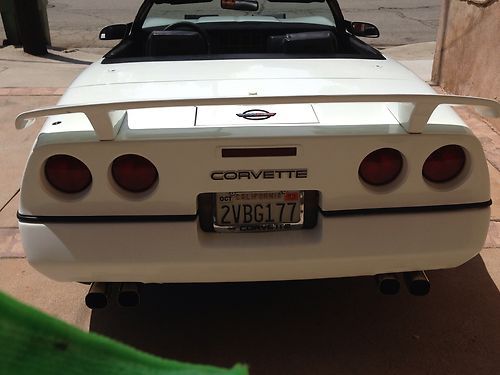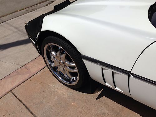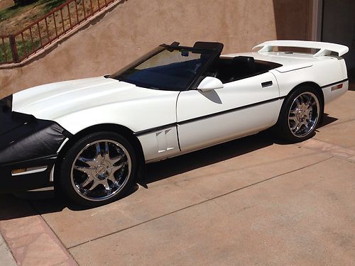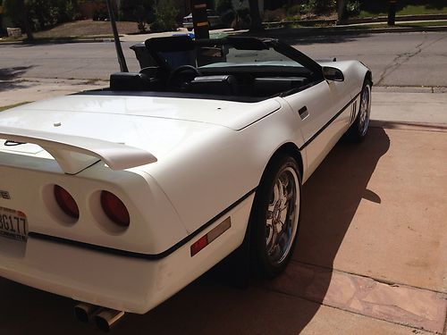 Up for sale is my 1989 white Chevy Corvette convertible with a black soft top. The car has 106k+ miles. I have owned the car for about 5 years. I only drove it a couplke thousand miles. It has always been garaged. I did some modifications to the body. I had a spoiler innstalled, put on a front bra, double chrome tips on the exhaust and put on $5k Giamelli rims. As far as everything else. The air blows cold, the interior is okay with just some minimal carpet tear on the driver side. All controls and displays on the dash work properly, including the radio. However, only 1 speaker works. Mechanically i have not noticed any major problems except a very minor oil leak. Engine was rebuild before i bought it as was told to me by the previuos owner. Tranny shifts okay. All lights work. Please email all your questions. Thanks for looking.