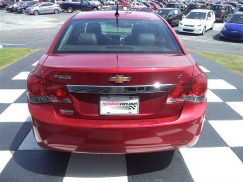 ======: Hendrick Certified. Excellent Condition. PRICE DROP FROM $16, 395, PRICED TO MOVE $1, 100 below NADA Retail! EPA 38 MPG Hwy/26 MPG City! Heated Leather Seats, iPod/MP3 Input, Satellite Radio, Onboard Communications System, CD Player, Overhead Airbag READ MORE! ======HENDRICK CERTIFIED: 10 Year/100,000 Mile Powertrain Limited Warranty. Plus, 12 month/12,000 mile high-tech coverage for steering, suspension, air conditioning, electrical, fuel system, brakes and heating system, all else excluded. Other benefits include: 24-Hour Roadside Assistance with Gasoline Assistance, Flat Tire Change, Battery Jump Start, Locked-Out Assistance, and Towing plus Rental Coverage, Trip Interruption Service (hotel, transportation, meal reimbursement), 168-Point Vehicle Inspection, and Free CARFAX Vehicle History Report (some limitations apply see dealer for details). ======KEY FEATURES INCLUDE: Leather Seats, Heated Driver Seat, Heated Seats, Heated Leather Seats. MP3 Player, Keyless Entry, Steering Wheel Controls, Child Safety Locks, Electronic Stability Control. ======OPTION PACKAGES: CRYSTAL RED TINTCOAT, PREFERRED EQUIPMENT GROUP. LT with 2LT with Crystal Red Tintcoat exterior and Jet Black interior features a 4 Cylinder Engine with 138 HP at 4900 RPM*. Serviced here, Non-Smoker vehicle, Fully Inspected. ======EXPERTS REPORT: Edmunds.com explains Chevrolet finally has a quality small car in the form of the 2012 Cruze.. Great Gas Mileage: 38 MPG Hwy. ======EXCELLENT VALUE: Was $16, 395. This Cruze is priced $1, 100 below NADA Retail. Approx. Original Base Sticker Price: $20, 700*. Closing Fee is included in the advertised/sales price. Pricing analysis performed on 6/6/2014. Horsepower calculations based on trim engine configuration. Fuel economy calculations based on original manufacturer data for trim engine configuration. Please confirm the accuracy of the included equipment by calling us prior to purchase. WE HAVE ACCESS TO THOUSANDS OF USED CARS THROUGH OUR SISTER STORES ALL OVER THE SOUTH EAST! GET MORE USED CAR FOR YOUR HARD-EARNED DOLLAR FROM HENDRICK HYUNDAI'S INTERNET SALES TEAM!