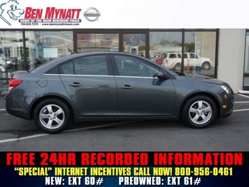 CARFAX 1-Owner, Excellent Condition. REDUCED FROM $16,988!, FUEL EFFICIENT 38 MPG Hwy/26 MPG City! iPod/MP3 Input, Satellite Radio, Onboard Communications System, CD Player, Aluminum Wheels, PREFERRED EQUIPMENT GROUP, Head Airbag READ MORE!======EXCELLENT SAFETY FOR YOUR FAMILY: Child Safety Locks, Electronic Stability Control, 4-Wheel ABS, Front Disc/Rear Drum Brakes, Tire Pressure Monitoring System Safety equipment includes Child Safety Locks 1LT with Cyber Gray Metallic exterior and Jet Black interior features a 4 Cylinder Engine with 138 HP at 4900 RPM*. ======EXCELLENT VALUE: Was $16, 988. ======VEHICLE FEATURES ~~~: MP3 Player, Keyless Entry, Steering Wheel Controls ======OPTION PACKAGES: PREFERRED EQUIPMENT GROUP. Maintenance up to Date. ======BUY WITH CONFIDENCE: CARFAX 1-Owner ======VEHICLE REVIEWS: CarAndDriver.com explains The Cruze brings a compelling mix of elegant styling and fuel economy to the compact-car ranks.. Great Gas Mileage: 38 MPG Hwy. ======MORE ABOUT US: Visit us Today! Dealer Award Winner for outstanding sales and service in the Charlotte region. We are one of North Carolina's Largest Certified Nissan Dealers. Our team is professional, offers you a no-pressure environment and operates with the quality you expect. Prices do not include taxes, tag, and $589 administrative fee. Pricing analysis performed on 6/16/2014. Horsepower calculations based on trim engine configuration. Fuel economy calculations based on original manufacturer data for trim engine configuration. Please confirm the accuracy of the included equipment by calling us prior to purchase.