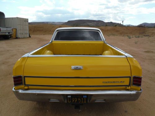 1967 EL CAMINO CALIFORNIA CAR, PLANT CODE (BF) FREMONT, CA. STILL HAS BLACK AND YELLOW PLATES. ENGINE IS A REBUILT CHEVY 350/350 H.P WITH ABOUT 15,000 MILES ON IT. 4 BOLT MAIN CASTING# 3970010 WITH DOUBLE HUMP 202 HEADS. HOLLEY STREET ADVENGER CARB WITH ELECTRIC CHOKE. EDELBROCK INTAKE. HEI IGNITION. HOOKER COMPETITION HEADERS WITH DUAL 2.5 IN. EXHAUST WITH FLOWMASTER MUFFLERS, HAS POWER STEERING WORKS GREAT. NEW BATTERY. TRANSMISSION IS A REBUILT TURBO 350 AUTO DONE AT THE SAME TIME ENGINE WAS. REAR END IS A POSI WITH A 355 GEAR AND UPGRADED AXLES, WAS REBUILT A FEW YEARS AGO. ALL NEW BRAKES INCLUDING MASTER CYLINDER. THIS EL CAMINO WAS A FACTORY AC CAR, JUST WOULD NEED COMPRESSOR/CONDENSER AND LINES TO WORK. INTERIOR HAS BEEN REDONE, REUPHOLSTERED BUCKET SEATS, NEW CARPET, DOOR PANELS WITH HANDLES, HEADLINER AND VISORS, STAINLESS STEEL SILL PLATES AND LOTS MORE. ALSO HAS PIONEER CD PLAYER AND CHEVELLE STEERING WHEEL. BODY IS PAINTED DAYTONA YELLOW, NEW DOOR AND WINDOW SEALS, NEW WINDOW FELTS. NEW FRONT WINDSHIELD,ALL THE GLASS IS IN GREAT SHAPE. SIDE AND BACK GLASS IS TINTED. ALL THE TRIM IS IN GREAT SHAPE. PAINT DOES HAVE A FEW SMALL CHIPS AND A SMALL DENT ON DRIVERS DOOR, BUT LOOKS GREAT WHEN DRIVING. WHEELS ARE 20 IN. OASIS RIMS WITH GOODYEAR EAGLE H.P TIRES 255/35/20, 90 PERCENT TREAD LEFT. TURN SIGNALS, HEAD LIGHTS AND WIPERS ALL WORK. CAR STARTS UP FINE, RUNS AND DRIVES CAR IS LOCATED IN YUCCA VALLEY, CA, 92284, 30 MILES NORTH OF PALM SPRINGS, CA CLEAR CALIFORNIA TITLE IN HAND MUST BE PAID IN FULL BEFORE PICK UP CALL 760-977-6308