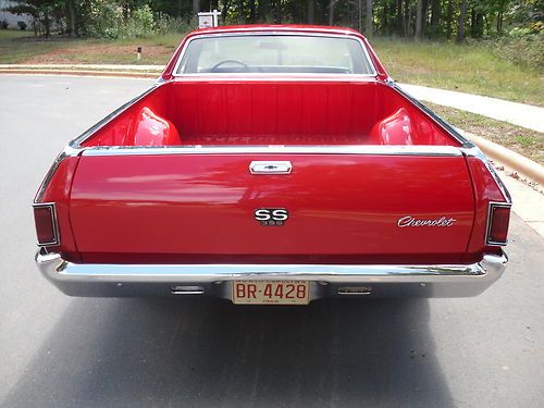1968 EL CAMINO SS real 138#.factory Red w/ Black inter. the car has had a semi frame off resto.(every thing pulled apart except the body shell from the frame.) just about everything has been replaced down to the wirring.the trans(th400) and rearend(12 bolt posi) are org. to the car.the engine is a fresh 1972 396 with ls6 type cam.the car was a factory a/c but was converted to no a/c years ago.also every one can see they left the 72 alt. system on it.i have most of the parts to put it back to 68 specs.you wil need pulls to change it back.all of the extra parts go with the sale of the car.if your looking for a real nice show and go rare ride this might be for you.please look at photos and ask questions.The car car be inspected by app.only. Terms of sale: Deposit of $ 1000.00 nonrefundable. through paypal. Bal due in cash or bank wire transfer. Buyer pays all shipping.i will assist as much as pos. i also have this listed local so i reserve the right to cancel this auction at any time. thanks for looking.