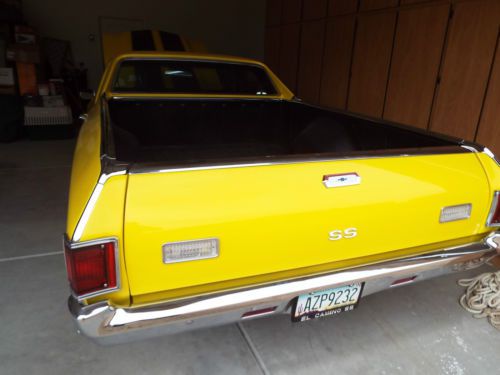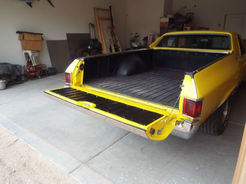 1970 SS El camino with 350ci sbc aprox 375 hp trick flow aluminum heads with roller rockers hooker headers nice mild 268/480 comp cam with mild lope edelbrock intake holley 600 cfm carb. 700r4 auto trans with overdrive completly and professional rebuilt to hold over 400 hp with shift kit and many other aftermarket performance parts, 2000 stall converter non lock up. power disc brakes in front drum rear, power steering. Factory A/C freshly restored and converted to 134A refrigerant and vintage air condenser. March surpintine belt syetem ,new paint and body work no rust at all. New classic 15" cragar wheels and BF Goodrich TA radials complete new interiour windshield,dash, seats, door panels,head liner carpet, locks wheather stipping wing rubber and door felt.outside all new door handles, mirriors, bed mouldings, wheel well mouldings,lail and front lens, both bumpers,emblems grill. New four core rariator and Two 16" spall electric fans.Suspention is in good shape drives nice,brakes are new rear end is a 10 bolt open rear end