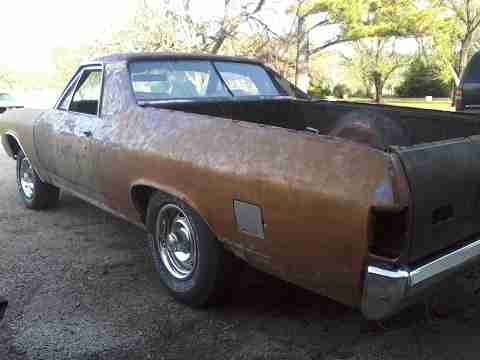 72 El Camino rolling body, was SBC w/ factory 4-speed, has floorshift column, clutch pedals, drum brakes, 10 bolt rear end, nice front clip and doors, drivers quarter is not bad, passenger quarter needs rust repair, good hood, roof, bed floor, tailgate has a dent, pretty straight car, has been soda blasted, needs body work, has power brake, power steering, factory air conditioning, has been sitting since 1988, missing seats (was bucket car) all glass is good, has most chrome moldings, North Texas Car, any pix or questions call Brian 501-779-5277
