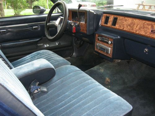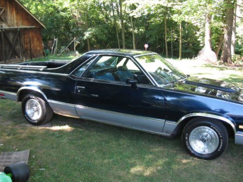 Up for auction: A nice looking 1982 Chevrolet El Camino with the Conquista trim package. It has 167,500 original miles. I am the third owner having purchased from the second owner’s widow. It was used as a weekend cruiser before his passing. The car appears to have been re-sprayed at some point with the two tone dark blue metallic and silver paint. Sadly the paint is beginning to chip in some places like around the hood cowl, door handles and license plate. This was a non smoking vehicle and the interior is nice for a car its age beside a bleach mark in the center of the carpet and split in the center of dashboard. Engine is the standard 305 C.I. 5.0L V-8 with an newer Edelbrock 1406 performer series carb and three speed automatic transmission that shifts nice and smooth. It runs and shifts GREAT! American Racing wheels have some corrosion but still have a nice shine. The front tires have about 55% tread left and the rear tires have about 50% tread left. Vehicle gets about 14 mpg and rides smooth. The car does have a few minor issues. It has power windows and locks but the locks do not work and