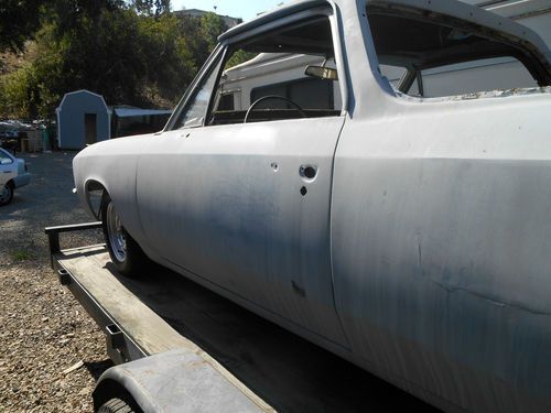 67 El Camino solid V8 power steering, power brakes, needs restoring, clean body! Car is complete all glass, trim, bed molding, bed radiator, radio & faceplate, solid floors, only rust around under windshield typical of all these older El Caminos. All you see in the picture. The inside of the truck bed is free of rust and no dents. The car trim was disassembled and removed for body work and have all pieces. Does run small block V8 engine. Stock 14 in rally wheels with TA radios. 2 Speed automatic matching number engine trims. Send a message for any questions, and all will be answered so feel welcome. These trucks are getting hard to find. So bid now!