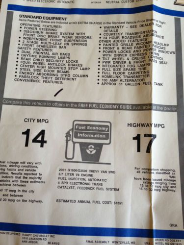 2001 Express LT Van Runs great! Selling as is ~ no warranty See original sticker with all features in the photos Known issues: CD is stuck in CD player. The AM/FM stereo works great. The VHS also works There is a short in the interior light; so the light does not go on. The rear door key entry does not work because someone tried to unsuccessfully break in. The door can be locked and unlocked using the interior door locks. Air conditioner needs a charge and works great with semi-annual charge Minor body dings and scrapes We are the original owners. The van has never been in any major accidents. We can provide records of oil changes, breaks, tires.... from Belle Tire (the only shop we used for the van) Most of the miles are highway miles. |