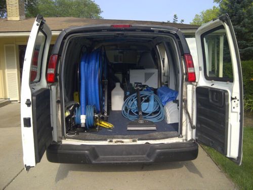 2003 Chevy Express 1500 with low mileage equipped with Pro Chem Blazer truck mounted carpet cleaning machine and all accessories. Everything you need to start your own carpet cleaning business. A great addition for existing carpet cleaning companies! System includes automatic pump out, recovery tank, 200' solution and hi temp vacuum hose, hose reel, stair tool, carpet rake, Evolution wand, blue cargo carpet in van, and carpet floor fan. Pro Chem Blazer installed by Jon Don, Inc. Sold as is.