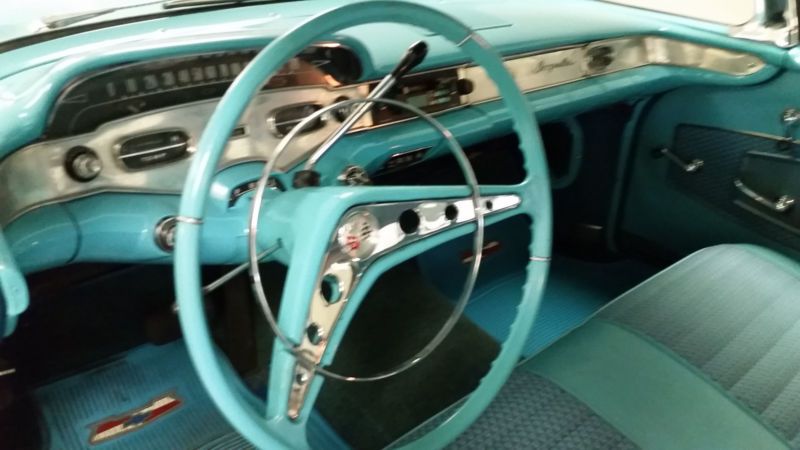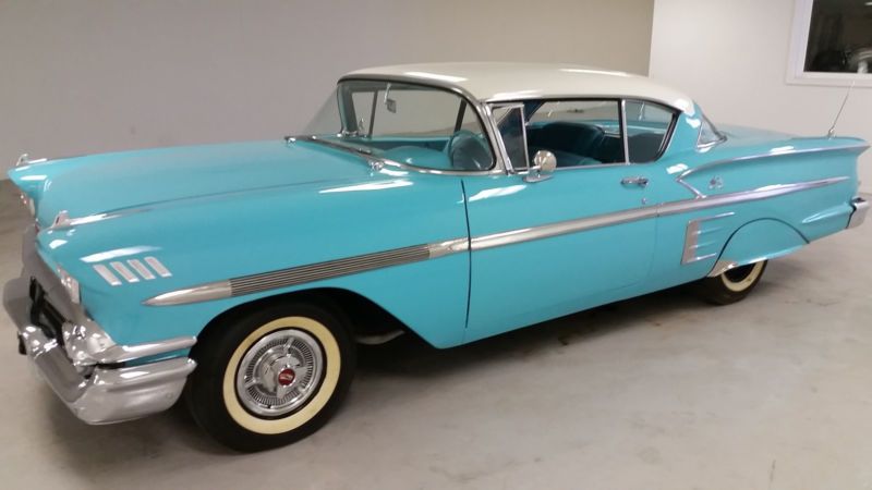 My 1958 Chevrolet Impala 2 Dr. Coupe is excellent throughout with straight and clean lines. The 2 tone teal and