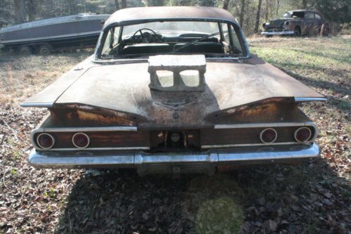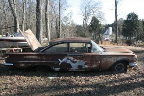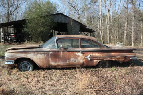 Selling this Impala from my brother-in-laws estate, who passed away over a year ago, so I don't know a whole lot about it. He has several vehicles in his "collection" and we are selling them to restore his favorite. I don't know if he drove it or had it towed to where it sits. It has been in the same spot, outside the barn for about five years or so. It is a complete car. The back window was broken out by some kids a couple of years ago so now the trunk is rusted out and the headliner is gone. It appears the chrome is all there several pieces missing are inside the car. The trunk lid springs are in great shape. If the cinder block wasn't sitting on the trunk, the lid would raise on its own. This could be a restoration project, but a lot of rust work is needed in the trunk area and there is also a hole in the driver floor pan. The are no door panels. The doors open and close very well. The front glass is free of cracks. The door windows are also good, but one vent window is broken. I don't know where the carburator and air cleaner are. The buyer will have to provide for shipping. One just like this sold on ebay last week for $2500, so the reserve is set a good bit lower. Bill of Sale only. Please email or call 770-386-8233 with any questions. On Jan-05-14 at 12:52:47 PST, seller added the following information: *** NOT IMPALA - - BEL AIR COUPE - - NOT IMPALA *** My fault. But all other descriptors are the same. Sorry. |