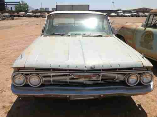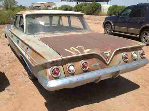 This is a 1961 Chevrolet Impala 4 door just rescued from the Arizona desert. Very nice body, sun beat interior and body. Glass is intact. V8 engine with automatic transmission. 4 doors are getting very popular and this is the top of the line Impala. Very little rust. Nice frame. I have applied for title, should have it in 10 days. If you have any additional questions, please call 435-770-3337. Thanks. Thanks