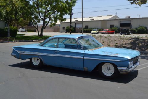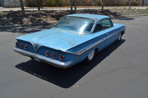 I found this car about 6 miles from my home in Pasadena California, it is an original Los Angeles car that was off the road for many years before I brought it back to life. The body was very solid with minor rust in both quarter panels and the trunk well. I have repaired the rust in the quarter panels using donor quarters from another 1961 Impala that was the same color as this one. The trunk well was replaced with a reproduction piece. I also patched a small section on the passenger side lower front fender. There are two remaining minor rust spots on the driver's side, one in the rocker and one on the bottom of the fender. The floors and frame are 100% rust free. Besides the hood the paint is all original, a careful application of CLR removed 53 years of surface rust. The hood that came with the car was not original and it was white, so I painted it in Jewel Blue. The side trim and headlight bezel assemblies are reproductions, the rest of the trim and bumpers are original. The windshield is new but the rest of the glass is original. All the suspension is completely redone. The front was totally disassembled and torn down, everything that could be replaced was. All the hard parts were powder coated along with the core support, inner fenders, hood latch brackets, battery tray and fender brackets. New parts include the upper and lower ball joints, inner and outer tie rods, center link, control arm bushings, idler arm, rag joint, shocks and adjusting sleeves. The rear suspension got the same treatment: the control arms, panhard bar and upper locating arm were powder coated and all bushings replaced along with the shocks. The stock rear axle was used, it was also gone through with new seals and fully inspected. It has 3.36 gears and is open. The front brakes are from Wilwood and feature 12.19" rotors and 4 piston Dynalite calipers. There's also a Wilwood tandem master and adjustable proportioning valve along with a Wilwood clutch master. The rear brakes are stock, and all new as are all the brake lines. The motor is a 6.0 liter (364 cubic inch) LS based iron block from a 2004 Silverado. I tore it down and everything looked great, as most of these motors do. I replaced the stock head gaskets with GM multi layer steel ones, and used head studs instead of the TTY head bolts. The heads were gone through and I replaced the valve springs with PAC pieces, they are nothing crazy just strong enough to close well against boost. Internally, the motor is otherwise stock with the stock camshaft still in place. Externally I added an Edelbrock Victor Jr. single plane intake manifold and low profile elbow. The oil pan is a heavily modified Hummer H8 unit. The transmission came from a 2004 GTO and works exceptionally well, very quiet and smooth. The clutch and flywheel are from Centerforce, the disc is a Dual Friction unit. I made my own swap mounts out of .250 cold rolled steel to get the motor just where I wanted it. The transmission crossmember is also custom made. The turbo system is based on a Turbonetics TC78 with the 1.15 A/R. I used a 38 mm Tial MV-S wastegate and a no name 50mm blow off valve. I made all the turbo piping, the hot side starts with stock cast steel truck manifolds flipped side to side and flows into 2" mild steel piping and a T4 flange. The downpipe is 3" and runs under the car into a single 3" oval tubing pipe setup with a single resonator and out the side. The car is surprisingly quiet around town. Everything is joined with stainless steel V band flanges and heat wrapped. The charge piping is all done in aluminum, it starts at 2.5" out of the turbo and goes to 3" through the air to air intercooler. It steps up to 4" out of the intercooler and into the throttle body. The fuel system starts with a Bosch 044 pump mounted on a custom made hanger in the tank, which is new. Dash 6 fuel ines (in push lock, hard line and braided steel) feed the Aeromotive fuel pressure regulator, which is boost referenced. Fuel goes to through the Edelbrock fuel rails to 60 lb/hr Seimens Deka injectors. There is enough fuel system and turbo to support 700 wheel horsepower, if so desired. I made my own radiator as well it's based on a triple flow core and tanks with a single 16" Spal fan controlled by the stock ECM. I also made the upper and lower radiator hoses in aluminum. Engine management is all stock GM, I used a later LS3/LS7 card style MAF to for increased range in a forced induction application. I started with an engine harness from PSI and tore it all down to nothing, then re-loomed and tucked the entire thing. The motor keeps the front O2 sensors but the tune deletes the rear O2 sensors, the EVAP, EGR and knock sensors. The rest of the car is completely rewired front to rear and everything works. There are several extra unused circuits which are ready to add air conditioning, power windows, radio, or any other accessory you might like. The interior is all new from Ciadella, it's beautiful. I chose to use 1962 Impala seat covers with 1961 door panels. The door handles, sill plates, package tray, window cranks, armrest reflectors and chrome trim are all new reproductions. I installed Dynamat on the floors and roof before the interior went in and it works great, the car is tight and quiet. There's a period correct trio of gauges on the steering column and a super cool Stewart Warner Greenline manifold pressure gauge in the dash. I made my own radio delete plate and my own shifter console, it looks like a stock one from a 1962 Impala SS. The shifter is a reproduction part from a 1962 Impala SS with a white 6 speed shifter ball. Finally, I substituted a 1962 Corvette steering wheel for the stock one. The car was dyno tuned by Steve Ridout at Powertrain Dynamics in Huntington Beach, California. We had issues with the rear tires on the dyno mostly because we could not spin the T speed rated tires(118 miles an hour) much past 130 without distortion. On the street this would not be an issue, but I don't thi