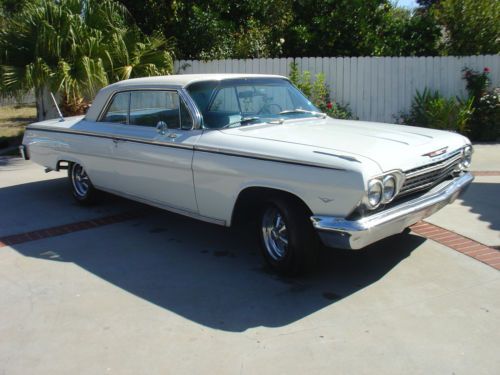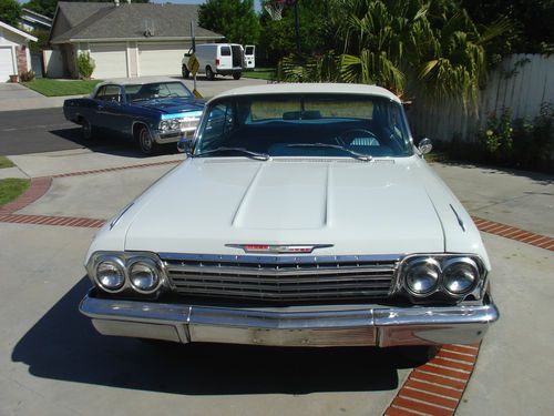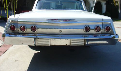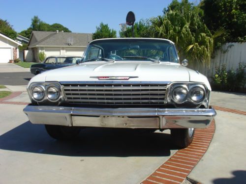 For sale I have a clean and all original 1962 Chevy Impala. Paint is in very nice shape, body is very straight. Has some craiger wheels with good tires on them. Interior is in excellent condition and has no tears or rips or anything. Engine is a 327 that was completely rebuilt that runs excellent and fires right up and runs real nice super smooth, no shaking, no noises, no smoke hooked up to a powerglide transmission. The entire front suspension has been rebuilt also with all new bushings even the body bushings are all new etc so car drives straight down the road and has no play in the steering wheel. Brake canister and all brake lines are all replaced and gone through. All the lights and guages and signals work on this car. It has power steering. Car is being sold As-Is with no warranty and is the buyers responsibilty to check car prior to bidding. Car is Located in Los Angeles and has a clean title in hand. I have sold a couple cars to overseas buyers and out of state buyers in the past and can offer to deliver the car to any of the shipping companys here in southern california or can give you the numbers to a few shipping companys ive used many times with no issues. Most of my cars end up selling before the auctions even end so i have the right to end the auction early if the car sells locally. IF YOU HAVE ANY QUESTIONS YOU CAN CALL ME ON MY CELL AT 714-401-3854 thanks