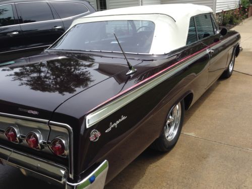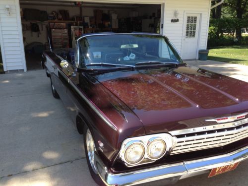 Excellent condition No rust, Frame off restoration finished in 2003. Frame sandblasted painted with Eastwood rust inhibiter then finished with Eastwood Chassis Black. All bushings tie rods gas and brake lines replaced nuts and bolts etc. Late model power steering installed, new brake shoes and cylinders Dual master cylinder, American Mags w / Goodyear P225R60 16x5 on front 16x6 rear. 409/409 Rebuilt, Crane Cam,Roll Rockers, Jans, Trw, Correct AFB carburetors Rebuilt,T10 4 Speed/stock tower W/ Hurst linkage .Lakewood Bell housing (have original ) 370 Rebuilt Posi Rear End. New white top, New Black Original Interior w/ power windows, black boot, AM/FM Hidden Stereo w / remote. 2 1/2 Exhaust Original wheels and SS spinner hubcaps INC All stainless replaced or repaired, All Chrome redone Color Dark Cherry VGC. Runs and Drives Excellent Too much to List |