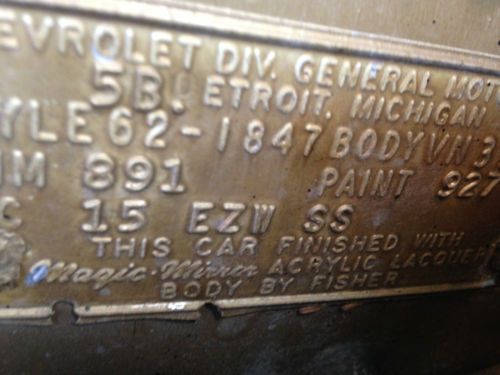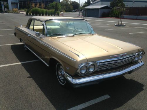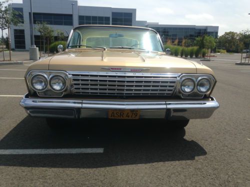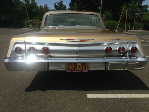 1962 SS Chevrolet Impala Anniversary Gold Trim 891 and Paint code 927 3rd owner Excellent running condition 86k original miles 2 speed power glide transmission shifts perfect 327 V8 all numbers matching all drivetrain is original untouched never re-built. Windshield has a crack in it. 1 re-paint 10 years ago still looks very nice and straight no dings or dents. Original interior very well kept condition. All new brakes flowmaster exhaust sound great very rare car only 300 made in the anniversary gold color just got back from a long trip runs great no over heating all suspension is original still feels new. Very little rust (see pictures) Fresh tune up. All chromes and moldings are original and clean. Overall great running and looking car. NO TRADES all the lights work well turn signals work and the heater and the defroster work too Good luck