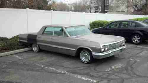 This 1963 Chevy Impala is a 4-door no-post. It is a project car. The frame is straight, the body is straight except for the dent in the right rear quarter. The guy that owned it before me had pulled the dent out. So there only touch-up body work need. Needs interior. The carpet kit had been pulled before I bought it. The floor pan is totally rust free. The rest of the car has very little rust. The quarters have no rust that I have found. The original 283 was pulled before I bought it, the previous owner had dropped in a 305 and mated it to the original Power Glide trans. Good solid car for a resto project. The car runs well. Has a cracked windshield but I have a replacement to go with. Just put new tires and wheels on three days ago. They are the original 14" size. I do have the 13" spoked rims seen in a couple of the pictures. So whichever look you like, there are rims for it. I have the trim pieces that are missing in the pictures. I have to move this car, my girl only wants me to have one project at a time! It is a beautiful classic. As-is you will get many thumbs-up driving it. Good luck bidding and enjoy!