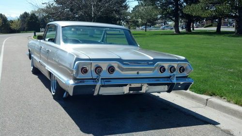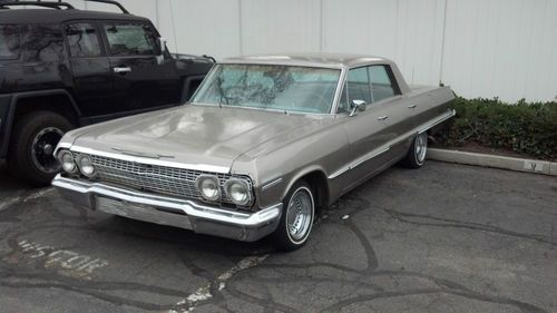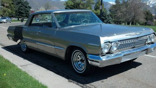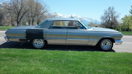 This 1963 Chevy Impala is a 4-door no-post. It is a project car. The frame is straight, the body is straight except for the dent in the right rear quarter. The guy that owned it before me had pulled the dent out. So there only touch-up body work need. Needs interior. The carpet kit had been pulled before I bought it. The floor pan is totally rust free. The rest of the car has very little rust. The quarters have no rust that I have found. The original 283 was pulled before I bought it, the previous owner had dropped in a 305 and mated it to the original Power Glide trans. Good solid car for a resto project. The car runs well. Has a cracked windshield but I have a replacement to go with. Just put new tires and wheels on three days ago. They are the original 14" size. I do have the 13" spoked rims seen in a couple of the pictures. So whichever look you like, there are rims for it. I have the trim pieces that are missing in the pictures. I have to move this car, my condo board is being ridiculous. It is a beautiful classic. As-is you will get many thumbs-up driving it. Good luck bidding!