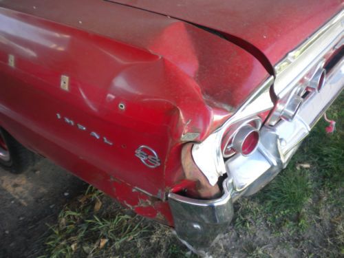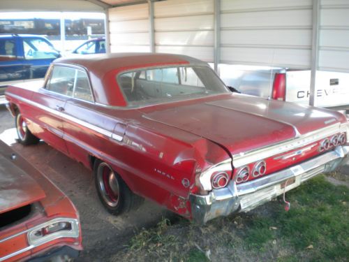 Hello up for auction is a 1964 Chevrolet Impala s.s car is a true s.s,the car is complete although the motor and tranny are not original. I was told when I bought the car that is was an original 409 car although I cannot confirm this, car does have the original tilt column with the cutout for the tach, and the tach is the 7 grand rpm tach. The car is a 4spd car that does come with a torn apart 4spd Muncie, the car will need front floor pans and the trunk replaced as it does have the usual impala rust. The car is not a rust bucket with rust peaking through every seem in the car. The car does have a clear bonded title which is the legal process you have to go through to get a title for a car that has had the title lost. Clear and in my name. Interior for the car is all here although not in the car and as you can see from the pics is in good original condition. Tach and instrument cluster are here and in nice shape also. The car has 16 inch aftermarket ralleys also on the car. The motor and tranny in the car is just a 350 c.i. with a turbo 350 that was put in the car to transport it as I am in the process of moving. Motor has rust in the cylinder walls and will need rebuilt. Thanks and good luck ! 308-440-5536