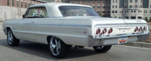 1964 Chevy Impala SS 409/425 HP 2x4 4 Speed. Newly restored. First-rate bodywork gives it a factory fresh look, and all the panels are crisp, detailed, and wave-free. Panel gaps are excellent throughout, and the build quality is evident even in the photos The paint is two-stage urethane and the finish is miles deep, a pure white with a brilliant shine that should last for decades given the right care. The '50s were over, and the cars of the early '60s were restrained in their use of chrome and trim. The grille is simple, framing quad headlights. The SS models received that cool engine-turned strip of trim running the length of the body. Correct new Impala SS badges are on the rear quarters, and the front fenders proudly wear '409' emblems, perhaps as a warning. In the early days of the horsepower wars, the dual-quad 409 was king. There was simply nothing else on the road that could touch its 425 horsepower, and in the Impala SS coupe, it was powerful enough to yank buildings off their foundations. Fresh and exceptionally well detailed, the engine bay in this car has "show winner" written all over it. From the chrome air cleaner with twin snorkels, to the Chevy Orange paint that's as good as the paint on my daily driver, to the unique 409 valve covers, it is sanitary and brilliantly executed. Finishes on all the ancillary components are correct, and the exhaust headers are some of the best. The hoses wear correct GM markings and wear tower hose clamps, the radiator is freshly restored, and even the hood pad is brand new. Honestly, until you've driven a dual quad 409, you haven't lived. The only transmission you want with your 409 is a 4-speed top off with a Hurst shifter, which feels like industrial machinery it's so precise and sturdy. The chassis has been completely restored, with a solid X-type frame and freshly rebuilt components present throughout. A new factory dual exhaust system. New shocks, freshly installed disc brake on the front, power steering and tilt steering make it a pleasure to drive, and it truly does cruise effortlessly at highly illegal speeds. Wheels are 18-inch Ridler wheels. A full set of the original SS wheel covers and the front drum brakes will be included with the purchase of the 64. The interior is simply beautiful, dressed in red to contrast the exterior. Pure '60s elegance all the way, with a sporty vibe, that was the Impala SS. The red buckets are in great condition as well as all of the door panels which house the electric window switches. The red carpets are also new with the correct weave and nap. A 7000 RPM 409 tachometer is installed in its own pod atop the steering column, which is about the coolest factory gauge installation you'll find. Stretching across the driver's side of the instrument panel, the restored speedometer shows crisp numbers and a crystal clear lens. Down low, another engine-turned panel houses the switch gear and the original AM radio, and matches the center console. All the correct SS badging is included, with emblems on the console and door panels.. In back, the spatter finish on the trunk floors and walls is correct, and it is protected by new mats. A matching full-sized spare and complete jack assembly finish the nicely appointed trunk. There's no question that these Impalas are surging forward in the market, and the top of the heap will always be the SS 409. With a hugely expensive, fresh restoration, this one is ready to show and enjoy and only you'll know what a bargain you got when you bought it. Lovely to look at and thrilling to drive, there's nothing else that drives like a 409, and even the handsome Impala sheet metal can't hide its performance car DNA. Compare this one to some lesser examples, and you'll see that this is a whole heck of a lot of car for not a lot of money. On May-07-14 at 07:16:16 PDT, seller added the following information: