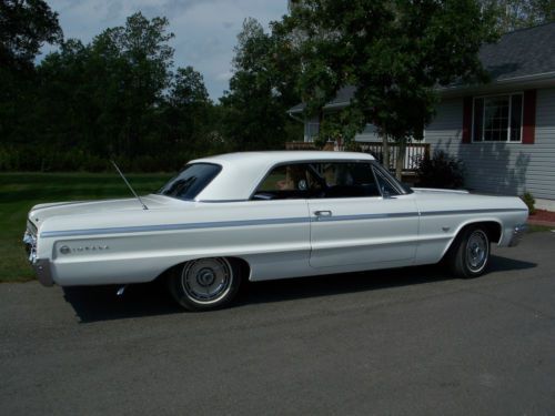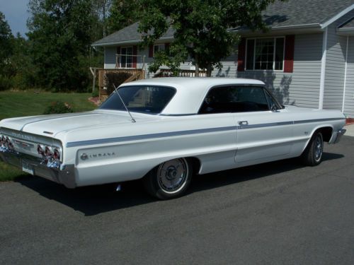 This is my 1964 Chev Impala SS all original from motor to hubcaps. There is approx 3,500 miles since complete overhaul. Has original 327 250 hp motor. Block was line bored and cylinders are bored .30 and crank ground .10, new pistons, rings, bearings, cam shaft and bearings, new carb, distributor, oil pump, fuel pump, water pump- the works. Has 2sp Powerglide tranny, pwr steering, pwr brakes and factory A/C Runs and drives very nice. Interior is just as nice, original bucket seats with center console, headliner & door panels are nice ( carpet at bottom of door panels could be replaced at sometime ) This is an original SS car in very nice shape. Was painted about 20 years ago from what I was told. Always was a white car. My wife and I have driven this car every summer and have attended many car shows and always get alot of attention. If you have any questions please call before bidding, my cell numbers is 1-218-766-7069. My reserve is a fair one for this car so do not ask. Payment of $1,000 within 7 days and balance in 15 days from close of bidding. WILL NOT ACCEPT PAY PAL, Will accept certified check or cash is better. Car will not leave here until check clears the bank. Buyer to pay for any transport cost. Thanks for looking and call with any questions.