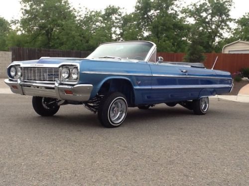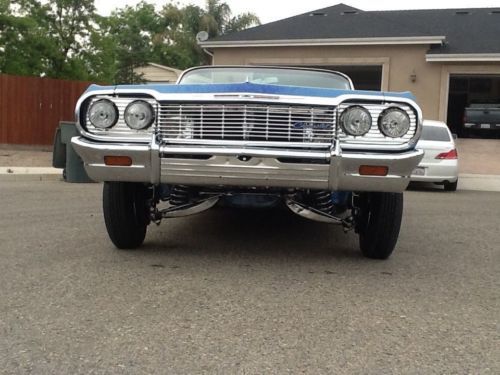 I'm selling a clean 64 convertible with fresh paint candy graphics new chrome and stainless , new interior , fully wrapped frame , chrome suspension , chrome extended and molded a arms , chrome lower a arms, chrome drive line with slip yoke , shortened and chromed rear axel , chrome gas tank, front and rear disk breakers , chrome inner fenders , lots of chrome and polished parts on the motor , chrome power steering pump , power steering , tilt steering colume front and rear bumper guards , chrome convertible rack , all glass in great shape , nice stereo system (4-10s ) 2 under back seat 2 in the trunk , sound stream cd/DVD player kicker amps and highs 3 pumps 10 batteries 4 switches ( front - back and rear corners) The set up is quick frame , set up and suspension built by Street Life Hydraulics in Arizona , paint by Modern art car is clean and ready to hit the streets and shows for info or questions call or text 559-799-7553 thanks