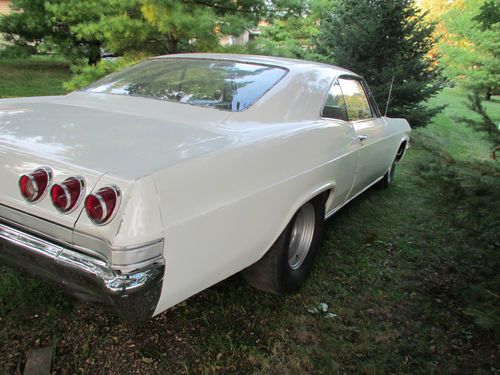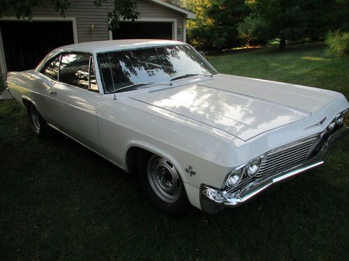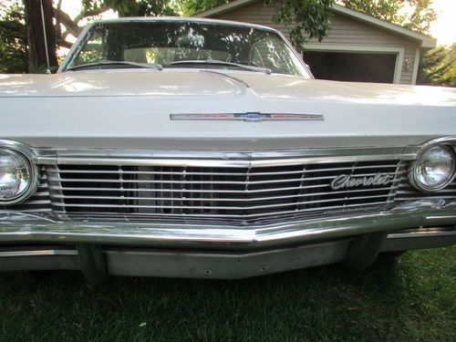 You are bidding on a 1965 Chevrolet Impala. This car was originally a Nevada car so the body is very solid. The only rust on the car are some small spots in the trunk which I have shown. The car has a 400 engine and an automatic transmission with a floor shifter which has a lock-out reverse feature. The is a running/driving car that runs very well. There are no options on this car and the brakes and steering are both manual. The car comes with many extra parts as shown in the pictures. The original color of this car was a silver-blue. It has one repaint which is the one shown (white). The paint is presentable as is with only a few small stone chips. The exhaust, tires, brakes, suspension are all good. The windshield has a crack on the passenger side and the rest of the glass is good. I can recommend a good transporter if you need one. Please call or write if you have any questions regarding this car. You or your mechanic/representative are welcome to come out and inspect the car. Good Luck!! 262-354-4970