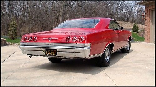 This 1965 Chevy Impala is a true survivor. With a BEAUTIFUL frame off restoration the car can with out a doubt be an award winner at a car show. The engine is a 283 but still a V8 and its so clean you can eat off it. the ride in this car was like floating back all the way to 1965 in a smooth red 65 impala. Underneath the car its SPOTLESS!! There is nothing wrong with that. The car also has duel exhaust and the sound it makes when its going is such a nice pur. Im telling everyone that looks at this car that it looks like it just drove off the show room floor. If you want a car that will have attention at a car show then i suggest you place a bid or buy it now. have a great day