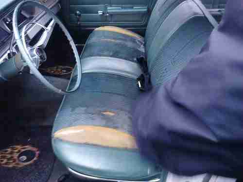 Thats it. Fix those 5 things and its mechanically a new reliable car. Cosmetically, it is old paint, has a smudge here a chip there, and a couple small rust bubbles, no rust showing yet, but overall, it still shines in the sun and it still turns heads, in fact you will be lucky to not have to stop and thank people for compliments every 2 blocks. It is a GREAT looking car. Inside looks great as well. It is aged, but has newer carpet on the floor, door panels are in great shape, headliner is in great shape. The front bench seat has two large (and ugly) rips, one at each end, but the front backrest is in great condition. In the back seat, there are two small rips in the same places as the front, the the early stages of the condition of the front seat, but they are very small, and the back-backrest is in excellent condition. Found a company in California who will sell you the original style factory seat material as well as new seat foam for $500.00 but I got along fine with a big green sheet for a seat cover. All the lights and gauges work, including an installed temp/oil/batt gauge. (temp gauge died, $25.00 fix) When the car runs, (with a muffler) its as quiet as a mouse and rides smooth as hell. Transmission is fine by the way.