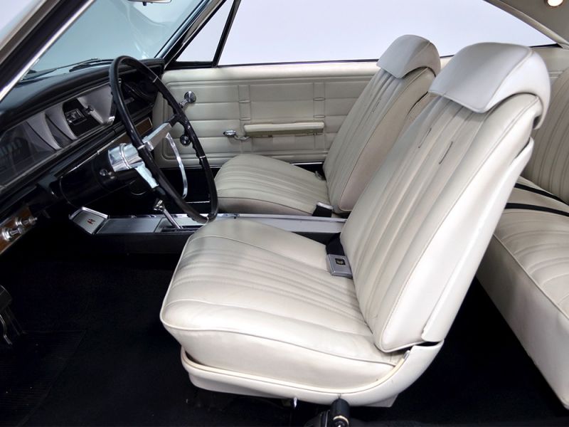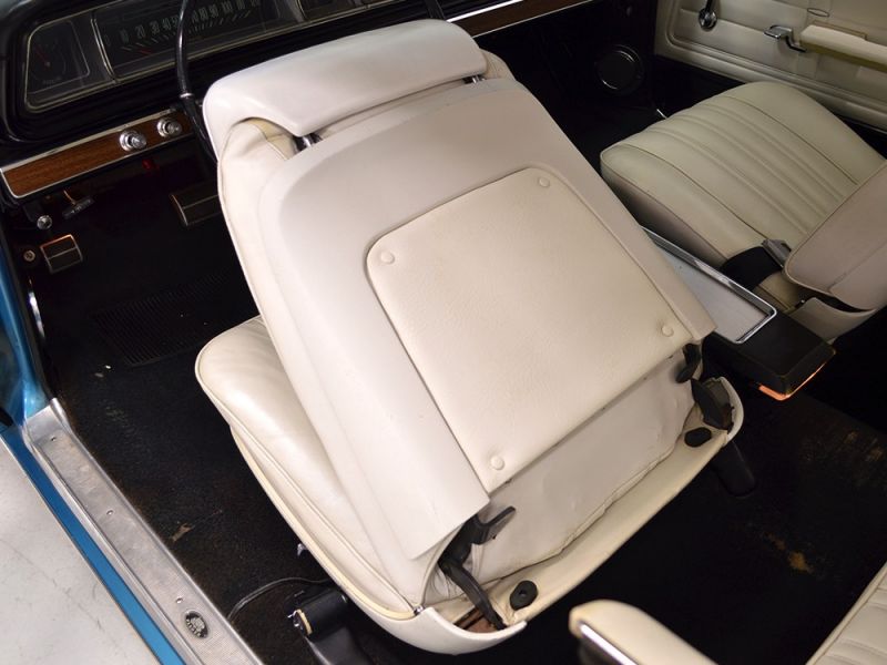 This car has them, along with relatively rare front seat headrests, which would not be federally mandated for another three years. The factory vinyl is in excellent shape with the only notable demerits being a small scratch on the driver’s outer bolster