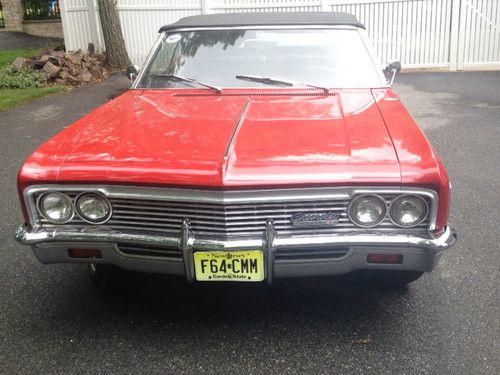 1966 Chevrolet Impala Super Sport, Regal Red/Black top; Convertible. Completely original numbers matching and correctly dated vehicle: including but not limited to: drive train, starter, generator, water pump. Loaded with original options beginning with the rare L77; 283/220hp 4 bbl dual exhaust with 2spd powerglide. Completely new and original black super sport interior. Power steering, power brakes, power windows, power top, power antenna (after market), power trunk opener, cruise control, Air conditioning, tilt-telescopic, am/fm correct console mounted multiplex, Gauge package with padded dash, In-dash 6K tachometer, front and rear bumper guards, trailer hitch with wiring, glass back window, 4 way flashers, tissue dispenser, day/night rear view and passenger side mirrors, original Super Sport hubcaps on perfectly reproduced: BF Goodrich Silvertown; 775x14 WSW bias-ply tires. This is as it was described to me when I purchased it. I just acquired my late father in laws 67 GS Convertible and need to make room. One of the most loaded 66's I have ever seen. Needs a/c clutch and and the top is slow. A real nice car!!