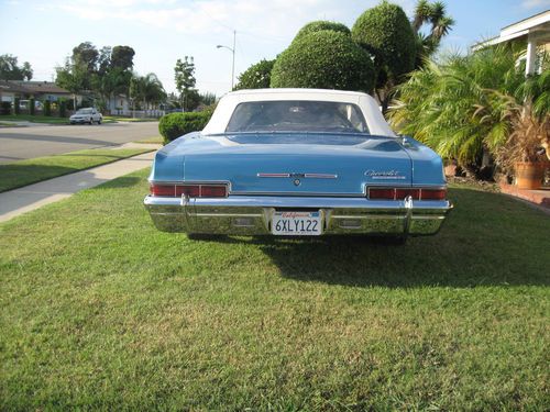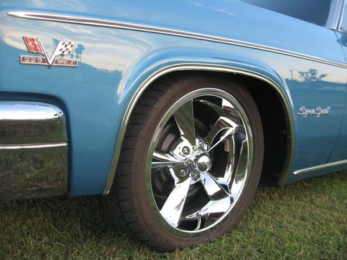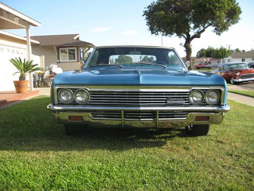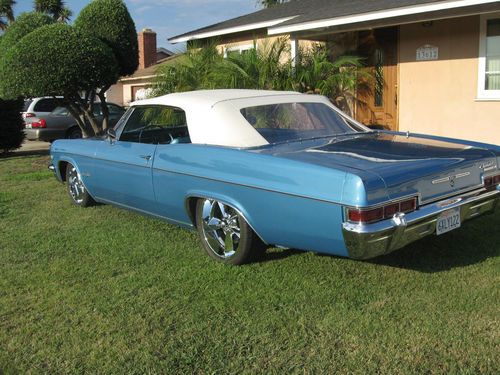 Hello Bidders, I have a real 66 Impala Super Sport Convertible up for sale that I picked up in the Sacramento area. Its a California car assembled in Los Angeles. Very solid rust free with all original floors ! Its powered by a 396 Big Block with 5K on Rebuild a M21 4 speed trans 12 bolt posi rear end. It has Sanderson exhaust manifolds with new flow masters & pipes all the way to the back. New Edelbrock carb. The motor is a true 66 engine #s indicate it was built on June 23 1966 so its #s correct but not VIN matching. Car has the factory tach in the dash & 4 cluster gauges above the console. Car has power steering & power brakes. I had a local body shop strip the paint off the car and re-paint it factory Marina Blue 2 Stage urethane base coat clear coat its been color sanded & buffed. Bumper chrome is in very nice condition and new side moldings. I had the interior re-done in factory Bright Blue Looks awesome! Factory power top in great working condition. Wheels & Tires are 235/40ZR18 & 265/35ZR20 nitto 555 tires Rims are B&G Old Skool Chromes. I also have the factory wheels with new radials & the Super Sport hub caps. This is a great running car that you can drive anywhere. Bidders with negative feedback will be cancelled bidders with less than 5 positive feedback contact me prior to bidding, I just don't want to play any games. Thanks for looking at my add & happy bidding!