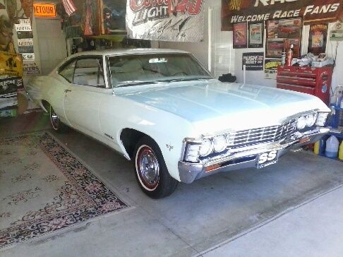1967 chevy impala ss for 15,000.00 "O.B.O." ",NO MAJOR RUST!!"org.rebt 327,V8s.b.ENG.--4bbl.Edelbrock Carburetor,,Automatic Powerglide Transmission maching numbers on vin.eng.and,trans,no oil leaks or smoke,,White upholistery and white headliner,NEW CARPET(aqua/turq).,CLEAN BODY, (small ding on top of car)..,NICE UNDER FRAME and FLOORING under seats.NEW FRONT AND REAR SUSPENSION,NEW DISC BRAKES infront with master cylinder booster,and new brakes and drums in rear..Car is painted pearl white with a little of mint color..Duel Exhust with chrome tips,.." runs nice and smooth for a 67 impala SS classic".Has 2013 DMV TAGS,also has black plates.has 90%new tires,P195/75R/14-white walls and ORG.SS hub caps.... its a 1967 SS classic NOT a 2014 NEW CHEVY.....car sold as-is, ""It needs someone who will do some work on it the way he likes,and appreciate it like i did.""......THANKS for your time..............Bill--9096895417--O.B.O