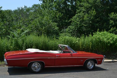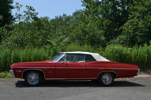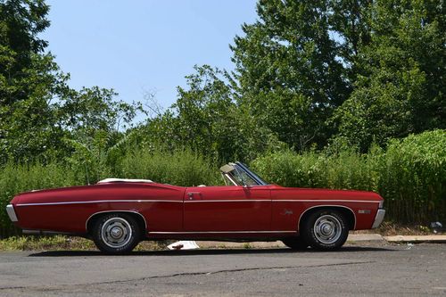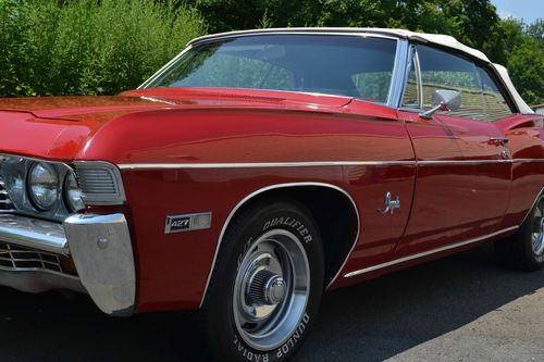 Up for sale is a 1968 Chevrolet Impala convertible. This is a very nice car that has great curb appeal. Badged as a 427 SS. The car started out its life as a small block base Impala. There is a later year 454 big block installed. Mechanically the car runs and drives well. It starts up every time and idles great. The dual exhaust makes for a great sound. The body is very straight with a beautiful bright red paint. There are some minor nicks and scratches. The bumpers are straight and in original condition. The top looks to be newer with a glass rear window. It goes up and down fine. The interior is also newer. It looks beautiful against the red body. The underside is in very nice condition. Frame,trunk and floors are nice. This is not a perfect car but, a great driver at an affordable price. This car be used as is or take it to the next level. If you would like to see this Impala in person or if you have any further questions feel free to contact me either through Ebay or by calling 203-927-2721. Thank you for your interest.