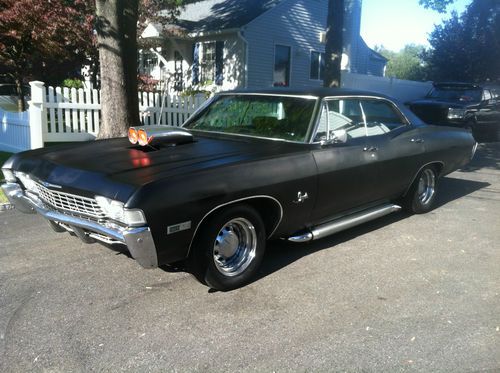 HI I AM SELLING THIS CAR FOR A FRIEND THAT DID SPENT A LOT OF CASH ON THIS COOL LOOKING 4 DOOR HARD TOP 1968 IMALA.. THIS IS A NUMBER MATCHING A/C CAR WITH A 307 V8 WITH A 2 SPEED POWER GLIDE TRANSMISSION. THIS CAR RUNS AND DRIVES AND SOUNDS 100% HAS 137000 ORIGINAL MILES ON IT. ALL LIGHTS,WIPER,DASH LIGHTS AND HORN IS IN WORKING ORDER. ALSO HAS A AM/FM RADIO THAT ALSO WORKS. GRILL AND BUMPERS ARE IN GREAT SHAPE FOR THERE AGE AND ALL TRIM. A/C COMPRESSOR AND TWO BRACKETS COME WITH CAR AND ARE ORIGINAL TWO IT. ALL A/C PARTS ARE STILL IN ORDER. I ALSO HAVE ORIGINAL FLOOR JACK. HERE IS A LIST OF NEW PARTS THAT WERE ADDED TO THIS CAR. BRAND NEW DASH PAD,BACK DECK AND BRAND NEW CARPET WAS INSTALLED. SEATS ARE IN GREAT SHAPE. CAR HAS A OLD SCHOOL CHAIN STEERING WHEEL THAT LOOKS PRETTY COOL IF YOU LIKE OR JUST CHANGE IT. CAR NEEDS NEW HEAD LINER AND DOOR PANELS BUT I DO HAVE ARM REST AND ALL THE INTERIOR WINDOW TRIM. CAR HAS NEW SUN VISORS AND NEW FRONT INTERIOR WINDOW POST. HAS BRAND NEW FRONT WINDSHIELD. THE ORIGINAL 307 ENGINE HAS A EDLEBROCK PERFORMER MANIFOLD WITH POLISH CARB BLOCK AND A 600 CFM WITH ELCTRIC CHOKE HOLLEY CARB. AND FUNCTIONAL SCOOP AND BRAND NEW CHROME SIDE PIPES HOOKED UP SO IT HAS TRUE DUAL EXHAUST THAT MAKES THIS CAR LOOK NUTS. CAR IS IN HOTROD BLACK SATIN. THIS HAS TO BE ONE OF THE COOLEST 4 DOORS AROUND WITH NO POST LOOKS GREAT WHEN ALL WINDOWS ARE DOWN . CAR HAS CHROME RIMS ALSO HAS CLEAN NEW YORK TITTLE REGGY.THIS CAR IS VERY SOLID TRUNK HAS JUST A COUPLE OF DIME SIZE HOLES AND THAT IS IT. THE REAR PASSENGER FLOOR WAS PATCHED AND THATS ALL.. CAR RUNS AND SHIFTS GREAT GREAT FOR FAMILY CRUSIER. ALSO COMES WITH BRAND NEW DOOR RUBBER. ALL DOORS AND DOOR JAMS ARE IN MINT SHAPE. CAR IS SOLD AS IS BUYER IS RESPONSIBLE FOR PICK UP OR TRANSPORT. I DO HAVE A TRANSPORTER THAT IS VERY GOOD AND YOU DO NOT HAVE TO WAIT ALONG TIME TO GET IT. I AM RETIRED SO I WILL HELP IN ALL WAYS WITH THE TRANSPORTING. PLEASE IF YOU ARE GOING TO BID REMEMBER THAT IT IS A REAL CAR NOT A HOTWHEELS TOY CAR. IF YOU HAVE 10 OR LESS FEEDBACK JUST EMAIL ME THAT YOU GOING TO BID ON IT..THANKS GUYS AND HAPPYBIDDING..YOU CAN DRIVE THIS CAR HOME...THANKS ! IF YOU NEED TO ASK ANY QUESTIONS FEEL FREE TO CALL. 718-915-2825