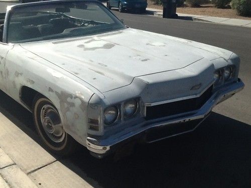 I have a very had to come by 1972 impala convertible, one just sold for 22,000$ on ebaymotor all stock,,, this convertible has 33,300 miles. Body work has been done, comes with her skirts,very strong motor, a/c car not connected, all panels are there. You can drive this project home like I did from Los Angeles to Las Vegas a few months ago. Needs new top I have a new white one for a extra cost and can have it installed. The buy it now price comes with free shipping after paid for. If you are looking for any impala or caprice then I am you guy. I posted some pictures of my other cars for sale. I'm Jay call me for any info any time, just remember, If the top goes down the price goes up!!! Good luck thanks for looking. 702 540 5252 Jay
